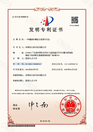 喜訊!安盈科技定位漏油檢測裝置榮獲國家發明專利